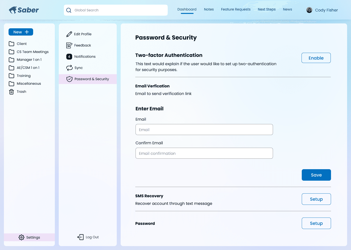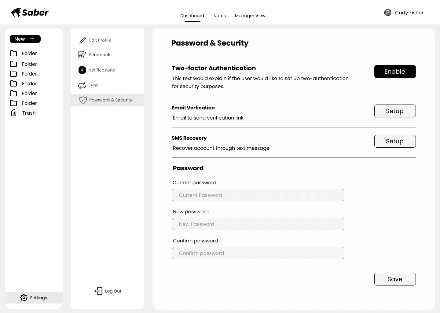 For security, I designed the Password & Security page with: