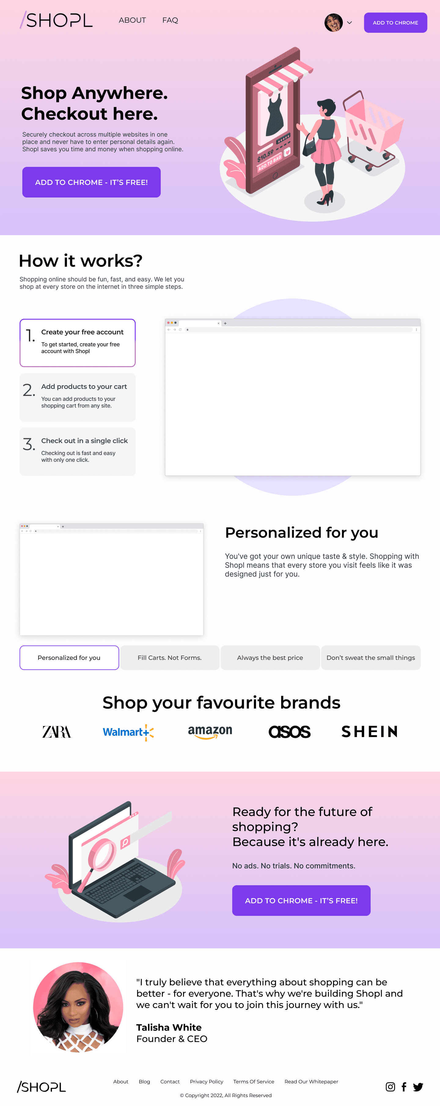 I redesigned Shopl’s landing page with the goal of increasing conversions by addressing key user concerns. The solution focused on: